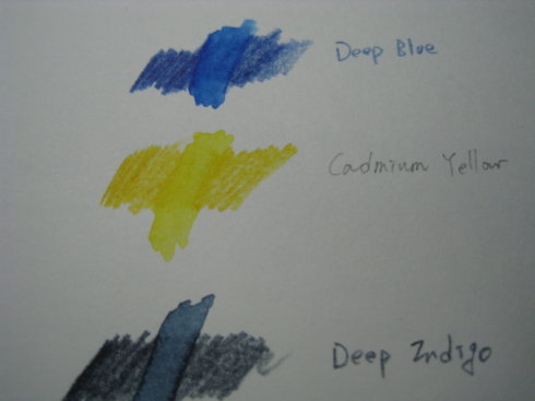 這套色鉛筆強調顏料溶水乾燥後所形成的永久性保護膜,第一次試塗時使用peacock blue + sun yellow試疊色性,有點心急所以peacock blue還沒完全乾時就接著塗sun yellow,結果sun yellow帶點藍色。第二次用deep blue + cherry,等deep blue完全乾後再把cherry沾水畫上,似乎還是帶了一點點的藍色,但可能是我沾到旁邊deep blue的乾燥顏料所造成的。