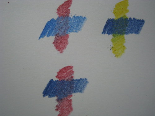 最近我買的3盒色鉛筆,三菱uni、玉兔和這個復刻版,奇怪都是紅、藍疊色效果不佳?真是的…