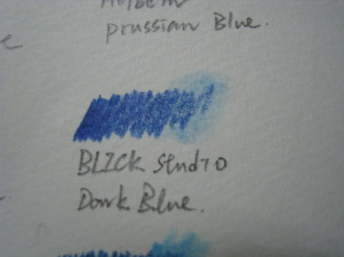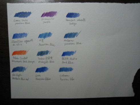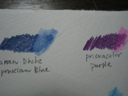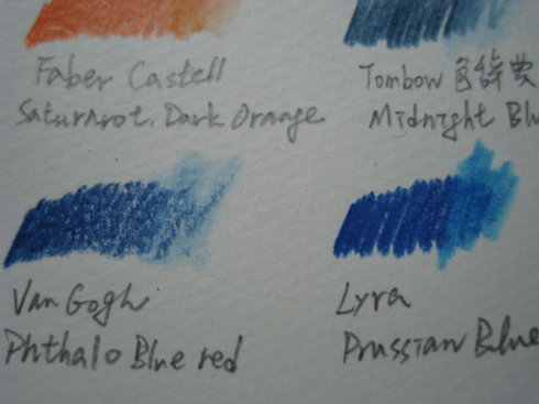 Holbein自家本身的色鉛是不用說了,卡達Pablo、Lyra polycolor及Faber Castell(綠)也溶得挺均勻地;其次是北星;幾乎無法溶解的是prismacolor及Tombow色辭典;完全無法溶解的是Staedtler ergosoft。