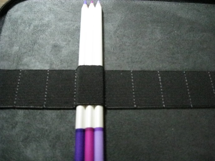 Derwent carry-all的設計適合外出用,一般室內用的話似乎有些複雜。一條鬆緊帶裝2枝筆,鬆緊度適中,直式排列。