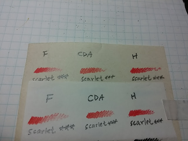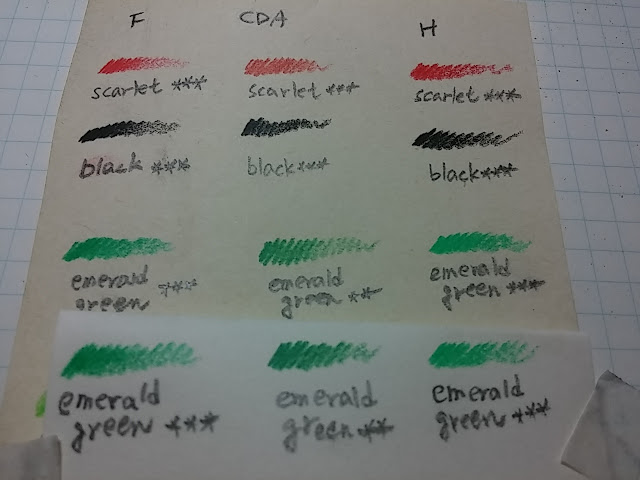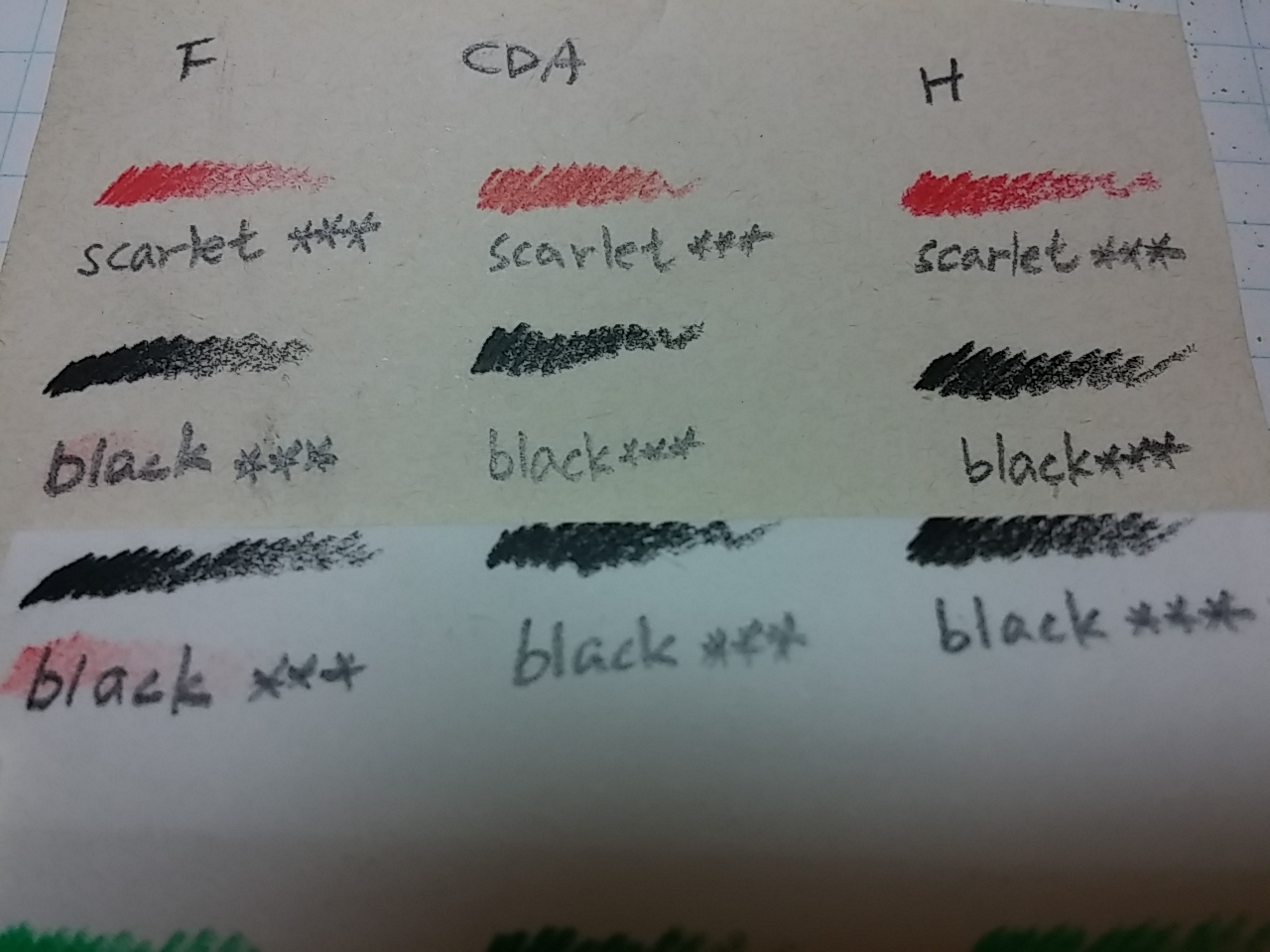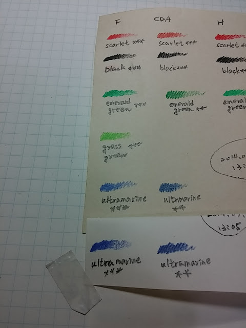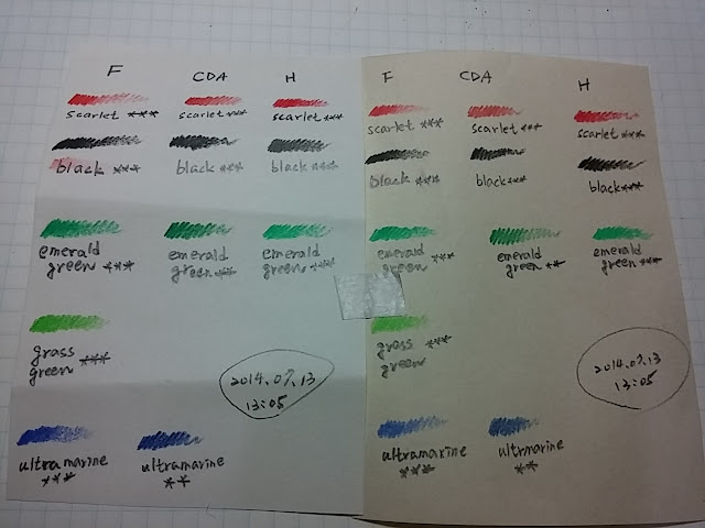 其實原本只想把這3家品牌同樣名稱的顏色拿來比較一下,後來想說乾脆作個簡單的耐光性測試好了。紙張用的是canson XL素描本,顏色選了scarlet、black、emerald green及ultramarine,另外輝柏多選了grass green。選這幾個顏色是因為當我把兩盒120色與150色的色鉛筆拿出來時,頓感一陣暈…數量太多啦~所以就只挑了少少幾個顏色,其中好賓因為當時沒找到ultramarine,所以ultramarine只比卡達與輝柏這兩家品牌。