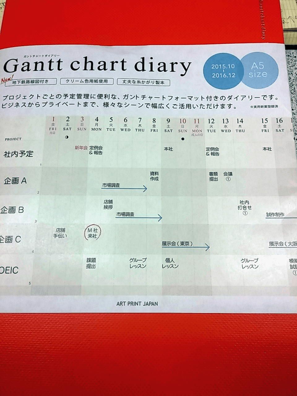 至於API甘特圖手帳則是逛誠品時看到,覺得可以對自己的一些計畫作紀錄與檢視。雖然可以用excel畫甘特圖表格,不過我覺得API手帳的紙質摸起來很舒服,紙張也是柔和的米黃色。A5尺寸而且厚度薄,放在包包裡面幾乎感覺不到手帳的存在,所以也成為2016我的手帳後宮之一。