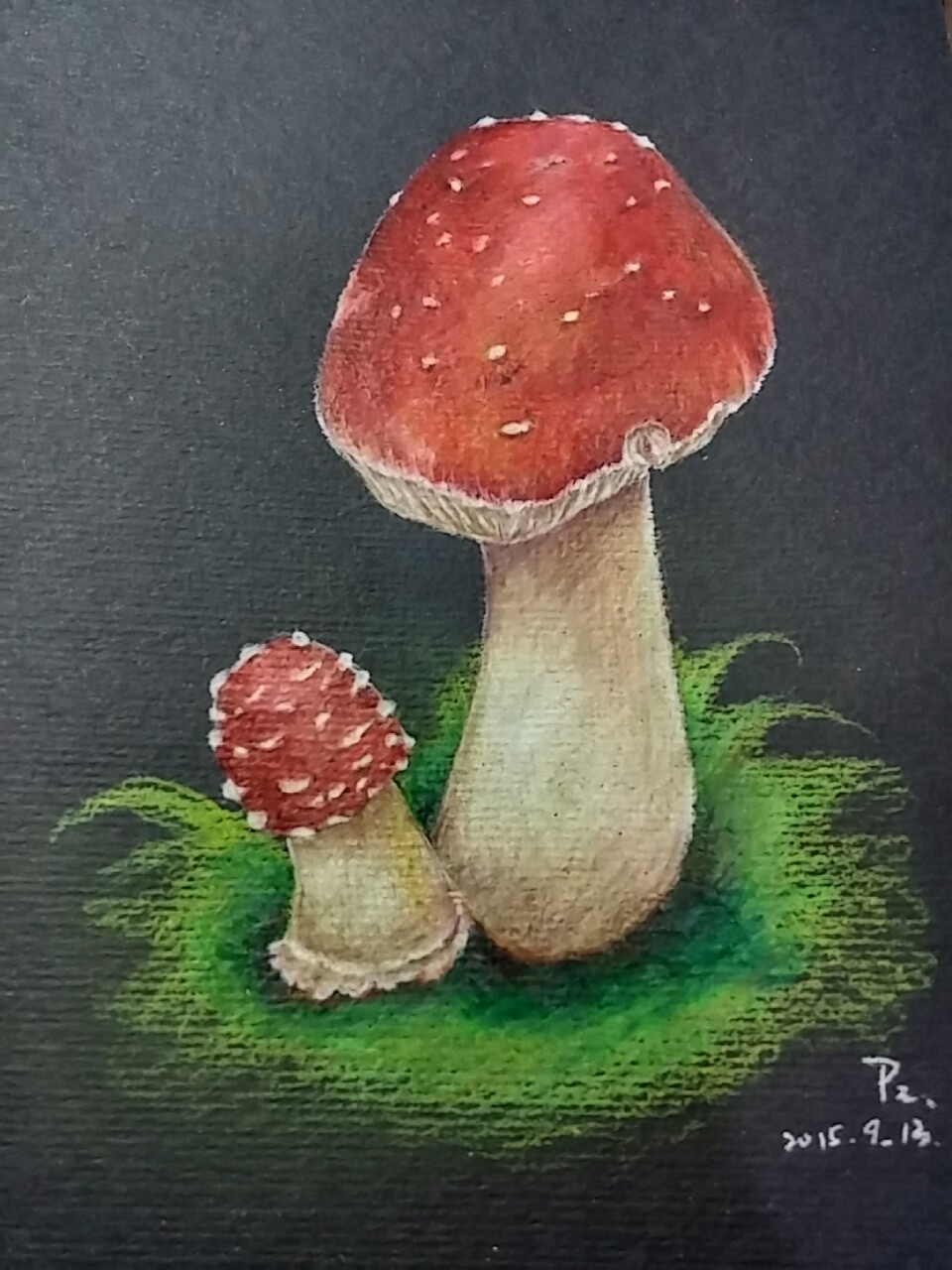 這本素描本的紙張正反面紋路都屬於中目,老闆介紹本子時說可以用來貼照片,但我主要是想用來畫色鉛筆。這次不畫蘋果、櫻桃、柿子了…:P,改畫個繪圖時間比較短的蘑菇。